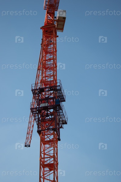 Красно-оранжевый строительный высокий кран на фоне ясного голубого голубого неба в солнечном свете дня в лучах солнца. Строительная площадка на фоне голубого неба, панорамный макет
