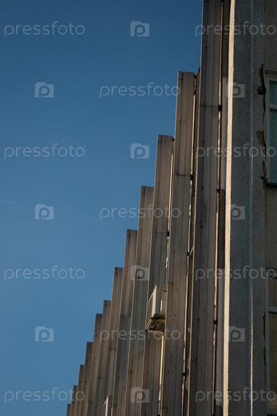 Высокое офисное здание в стиле модерн под золотым солнцем с цилиндрическими остроконечными колоннами и кондиционером на фоне ясного голубого неба. Советская архитектура. Бизнес и успех