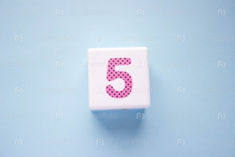 Фотография крупным планом белого пластикового куба с розовой цифрой 5 на синем фоне. Объект в центре фотографии