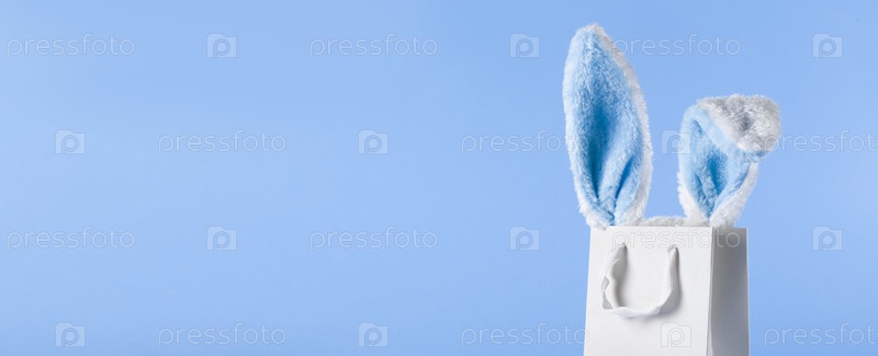 Широкий баннер на синем фоне. Концепция интернет-магазинов на Пасху, покупки и продажи к празднику. Подарочный пакет с заячьими ушками и пасхальными яйцами