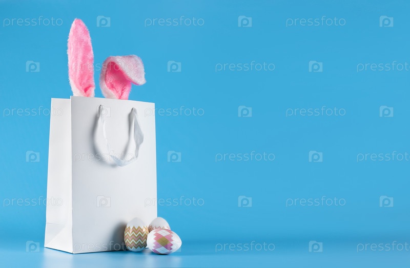 Широкий баннер на синем фоне. Концепция интернет-магазинов на Пасху, покупки и продажи к празднику. Подарочный пакет с заячьими ушками и пасхальными яйцами