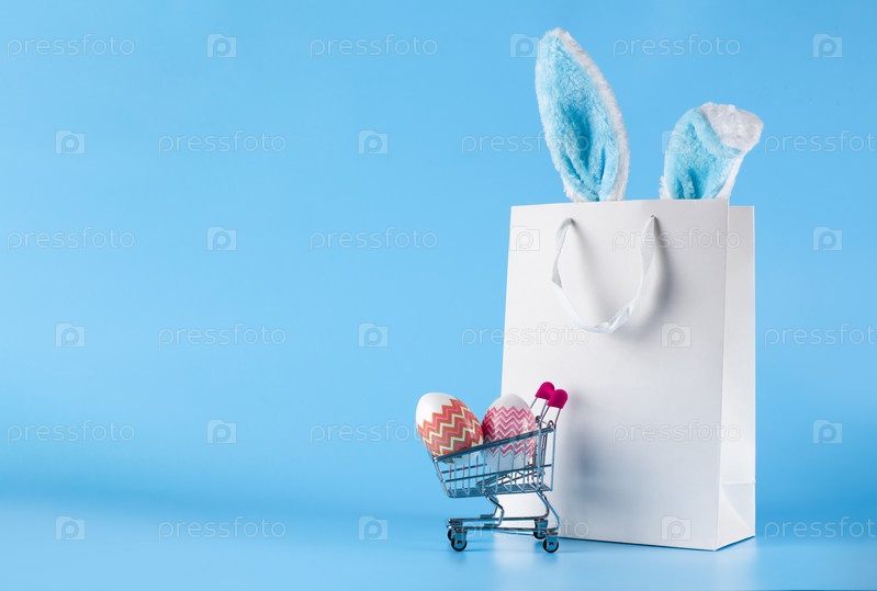 Пасхальный баннер, подарочный пакет и корзина на синем фоне. Концепция пасхальной распродажи, покупок, доставки товаров к празднику