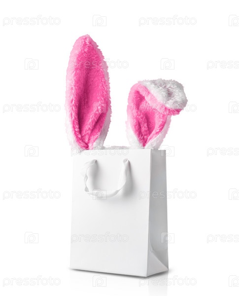Фото на белом фоне. Концепция интернет-магазинов на Пасху, покупки и продажи к празднику. Подарочный пакет с заячьими ушками