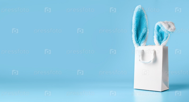 Широкий баннер на синем фоне. Концепция интернет-магазинов на Пасху, покупки и продажи к празднику. Подарочный пакет с заячьими ушками
