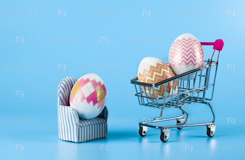 Идея доставки покупок на дом на Пасху, на синем фоне, концепция интернет-магазинов, электронной коммерции, продаж