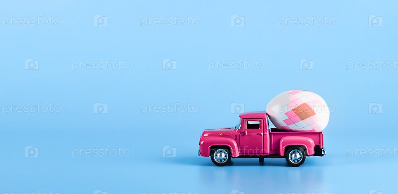 Розовый автомобиль на синем фоне с пасхальным яйцом сзади. Широкий баннер с местом для текста. Концепция доставки пасхальных покупок