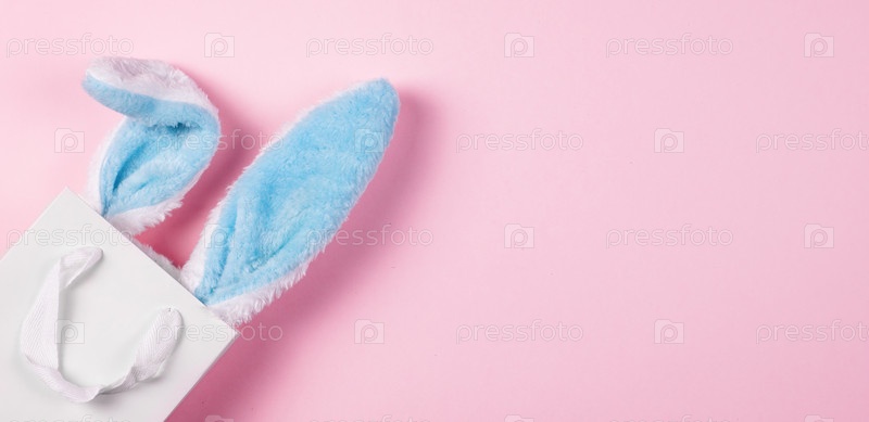 Широкий баннер на розовом фоне. Концепция интернет-магазинов на Пасху, покупки и продажи к празднику. Подарочный пакет с заячьими ушками
