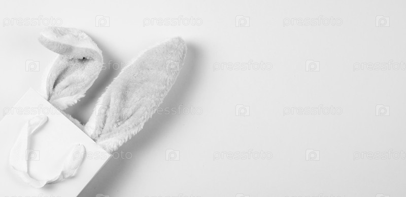 Широкий баннер на розовом фоне. Концепция интернет-магазинов на Пасху, покупки и продажи к празднику. Подарочный пакет с заячьими ушками