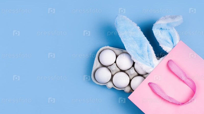 Широкий баннер на синем фоне. Концепция интернет-магазинов на Пасху, покупки и продажи к празднику. Подарочный пакет с кроличьими ушками и пасхальными яйцами