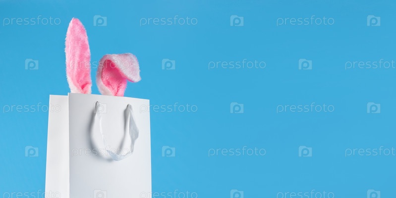 Широкий баннер на синем фоне. Концепция интернет-магазинов на Пасху, покупки и продажи к празднику. Подарочный пакет с заячьими ушками