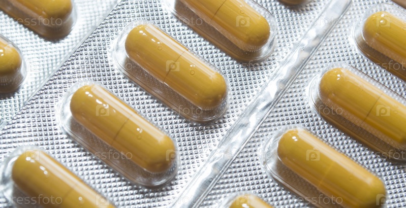 Желтые капсулы таблетки таблетки в серебряном блистере крупным планом