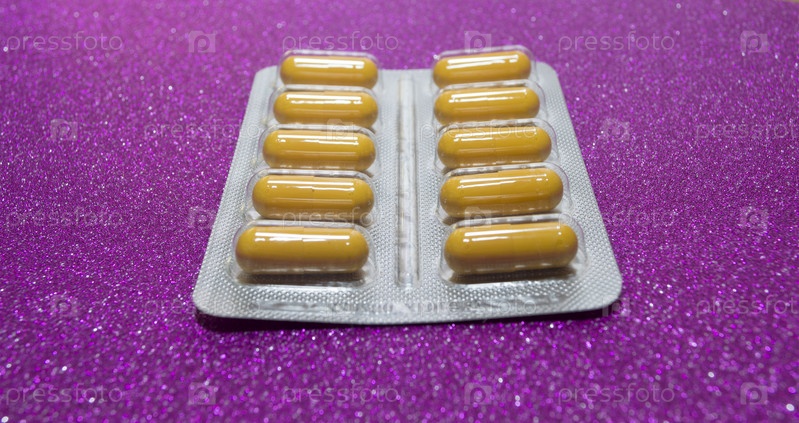 Желтые капсулы таблетки таблетки в серебряном блистере на малиновом фоне крупным планом