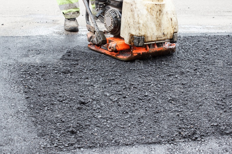 Рабочий трамбует асфальт на дороге механическим трамбовщиком. укладка дорожного покрытия. горячий асфальт под напором трамбовки