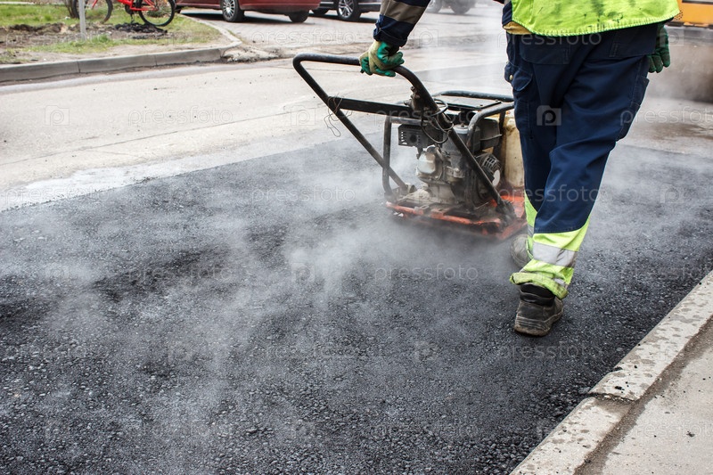 Рабочий трамбует асфальт на дороге механическим трамбовщиком. укладка дорожного покрытия. горячий асфальт под напором трамбовки