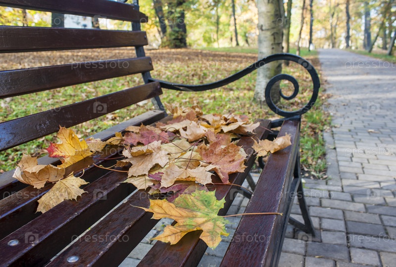 Желтые кленовые листья лежат на скамейке в парке