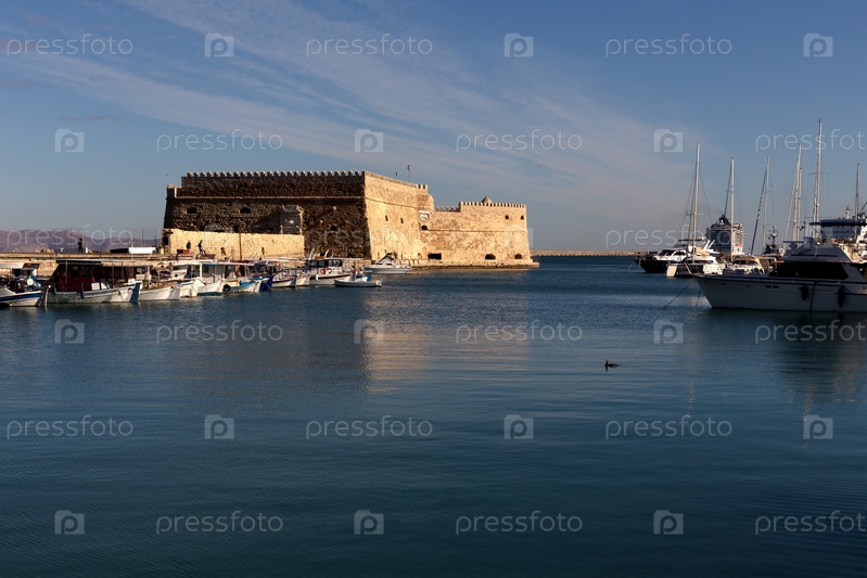 Древняя, городская, средневековая, морская, венецианская крепость Кулес (остров Крит, город Ираклион, Греция) и рыбацкие лодки солнечным утром