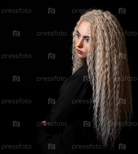 Портрет молодой блондинки с длинными вьющимися волосами в студии на черном фоне