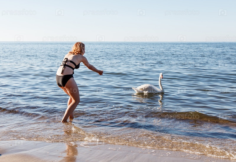 Молодая девушка в черном купальнике кормит лебедя у моря