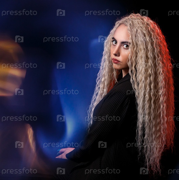 Портрет молодой блондинки с длинными вьющимися волосами в студии на черном фоне