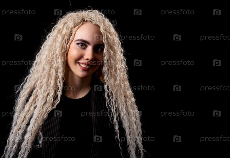 Портрет молодой блондинки с длинными вьющимися волосами в студии на черном фоне