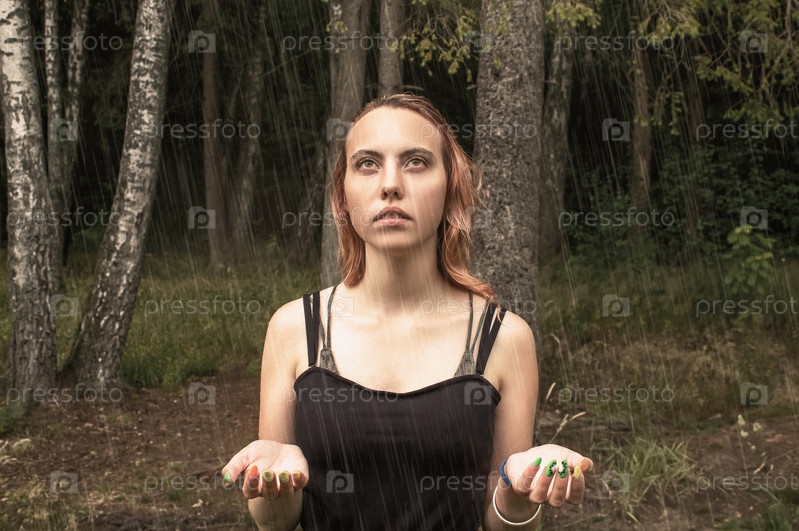 Портрет молодой красивой блондинки в парке под дождем