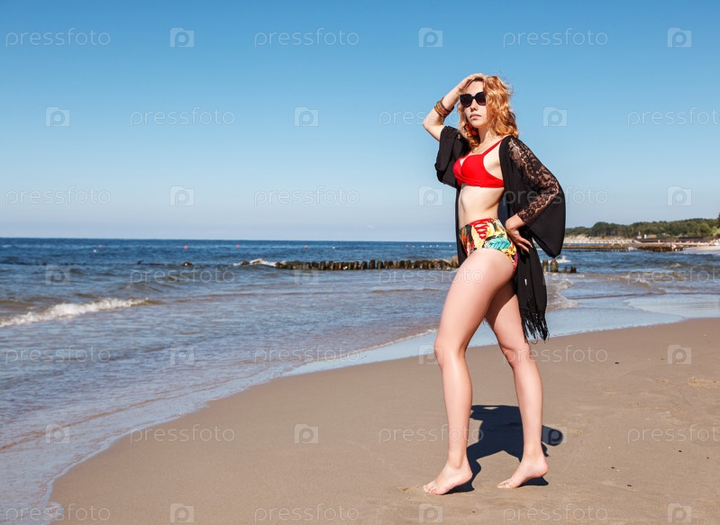 Молодая блондинка в красном купальнике, солнцезащитных очках и черной накидке стоит на берегу моря