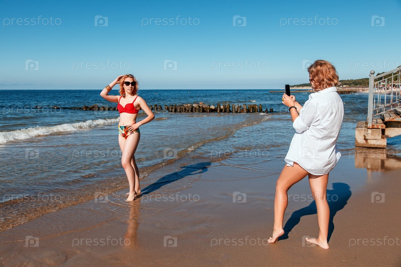 Две девушки в купальниках фотографируют друг друга на смартфоны