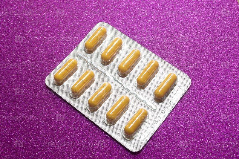 Желтые капсулы таблетки таблетки в серебряном блистере на малиновом фоне крупным планом