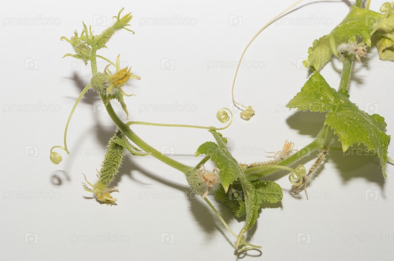 Молодой зеленый огурец с цветком на белом фоне