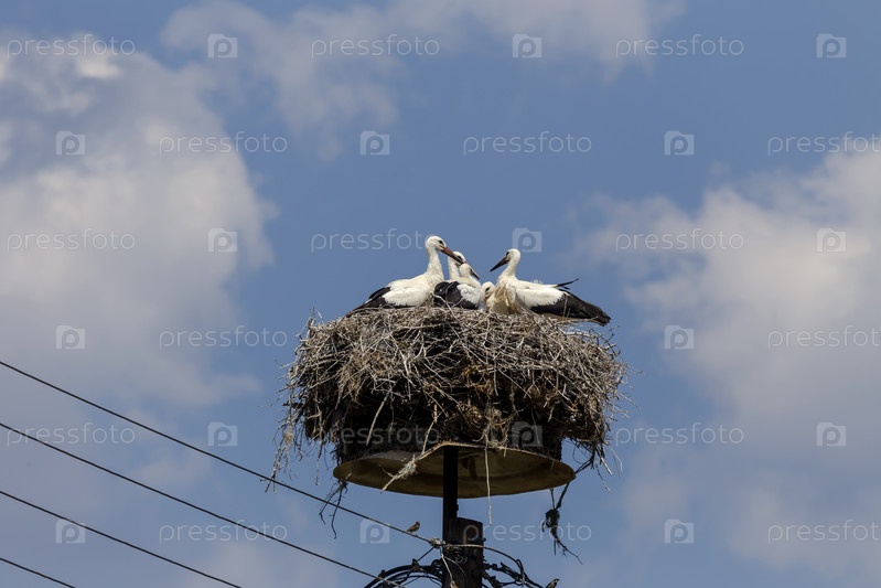 Птенцы взрослого оленя (Ciconia ciconia) в гнезде на фоне голубого неба