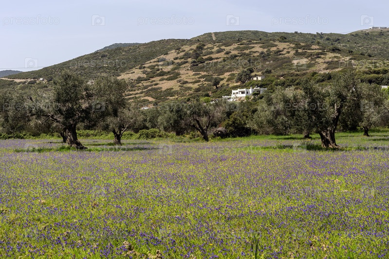 Оливковые деревья растут на лугу с полевыми цветами в солнечный весенний день