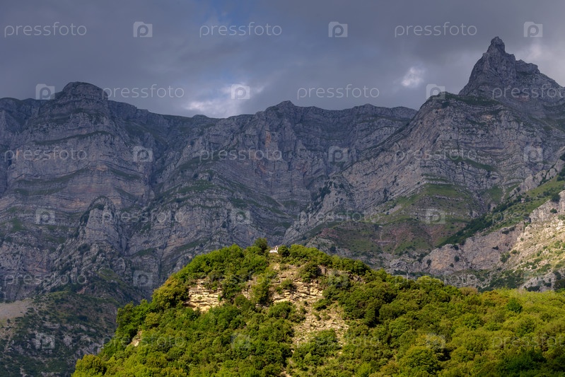 Величественная гора и небольшая церковь в пасмурный день (район Цумерка, Эпир, Греция)