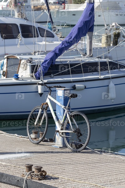 Езда на велосипеде по набережной крупным планом на фоне яхт и моря