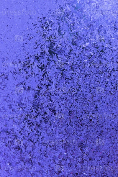 Ярко-синий морозный узор на оконном стекле в качестве абстрактного зимнего фона