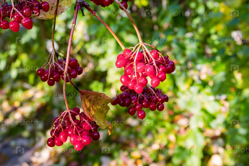 Красивый осенний фон с красными ягодами калина. Зрелые виноградные лозы Viburnum vulgaris Lat. Калина опулюс