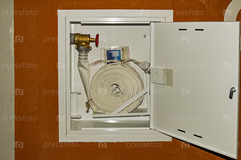 Пожарная безопасность в квартире. Пожарный шланг в коробке с водой для тушения пожара. Тула, Россия
