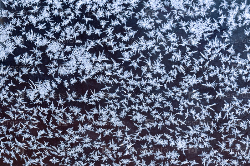 Ярко-синий морозный узор на оконном стекле в качестве абстрактного зимнего фона