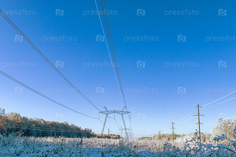 Провода линий электропередач или линии электропередач, покрытые снегом на фоне голубого неба, Тульская область, Россия