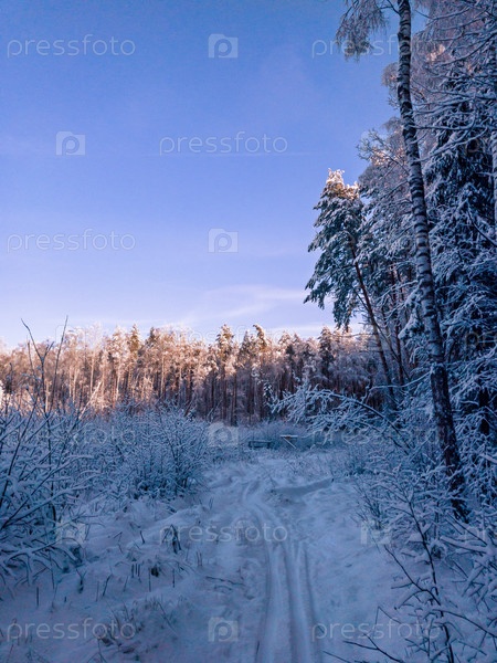 Заснеженные деревья в зимнем лесу. Лыжная трасса в зимнем лесу