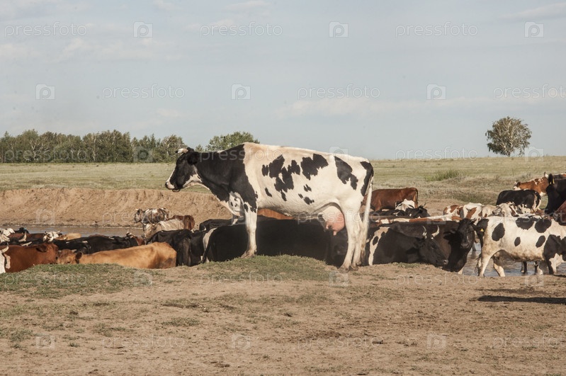 Испытывающие жажду коровы пьют воду из водопоя, водоснабжение домашних животных на свободном выгуле