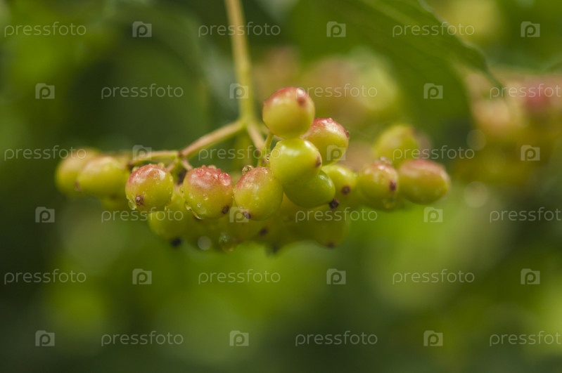 Ягоды и листья калины вибурнум опулус летом на открытом воздухе. Красные ягоды калины на ветке в саду