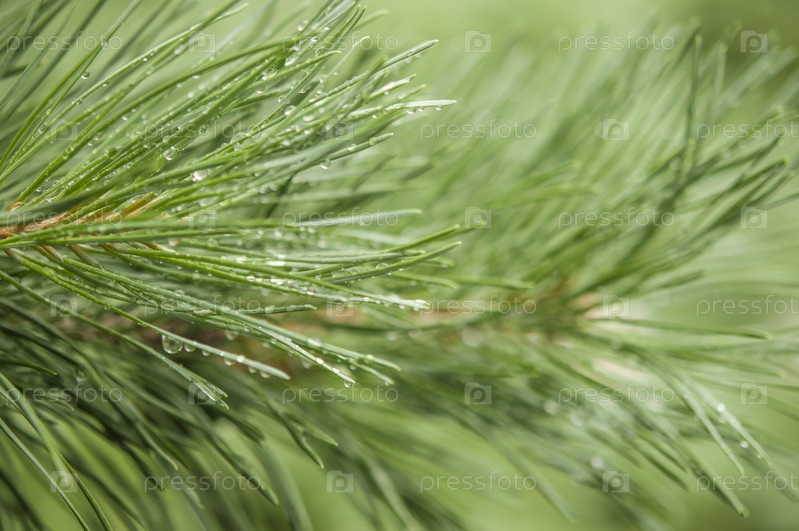 Сосновые иглы с большими каплями росы после дождя