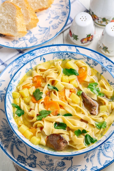 Домашняя лапша с куриным бульоном и овощами