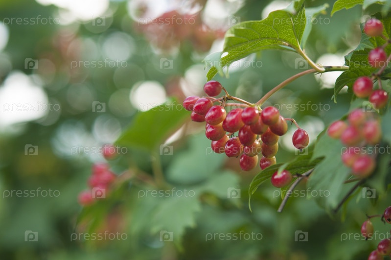 Ягоды и листья калины вибурнум опулус летом на открытом воздухе. Красные ягоды калины на ветке в саду