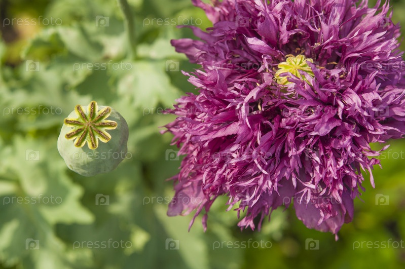 Розовый пионовидный махровый мак в летнем саду крупным планом