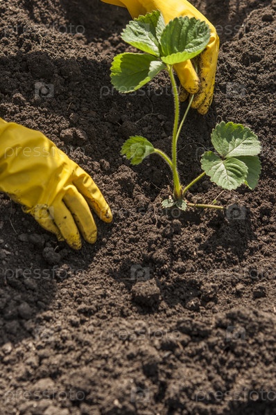 Вид рук, сажающих клубничный куст в землю на грядке