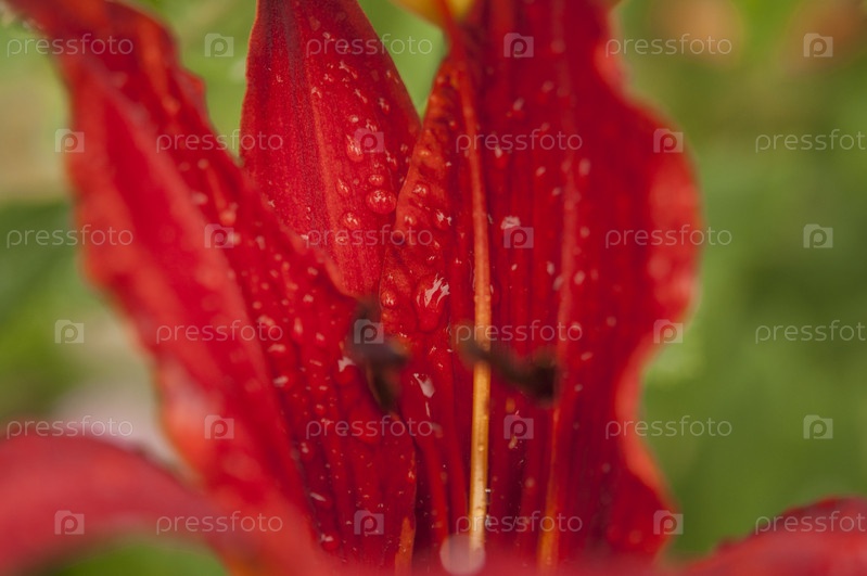 Большие и маленькие капли воды после летнего дождя на ярком лепестке цветка лилии в природе на открытом воздухе, макро, мягкий фокус