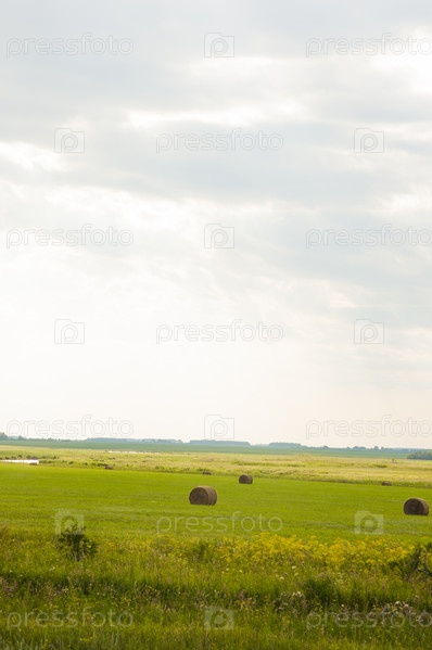 Стога соломы сложены тюками сена, оставшимися от уборки урожая, поле сельскохозяйственной фермы с собранным урожаем. Пейзаж соломенных тюков на фоне облачного неба