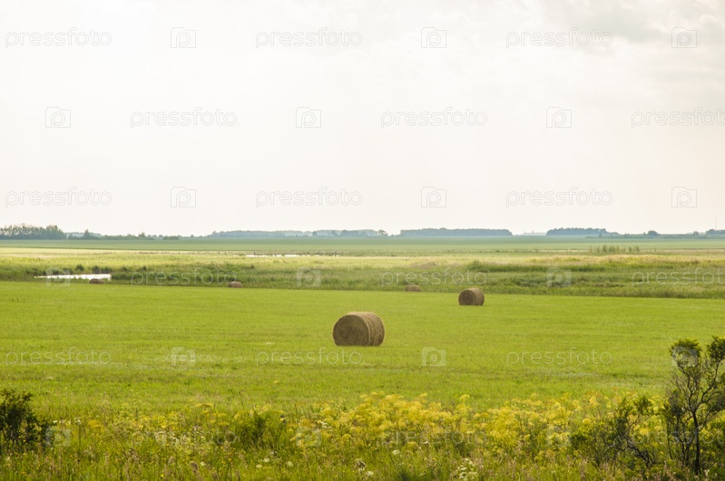 Стога соломы сложены тюками сена, оставшимися от уборки урожая, поле сельскохозяйственной фермы с собранным урожаем. Пейзаж соломенных тюков на фоне облачного неба