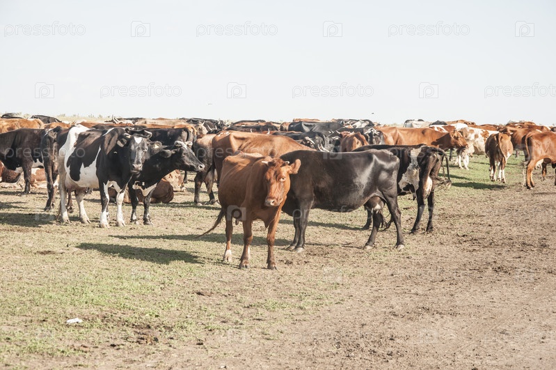 Испытывающие жажду коровы пьют воду из водопоя, водоснабжение домашних животных на свободном выгуле